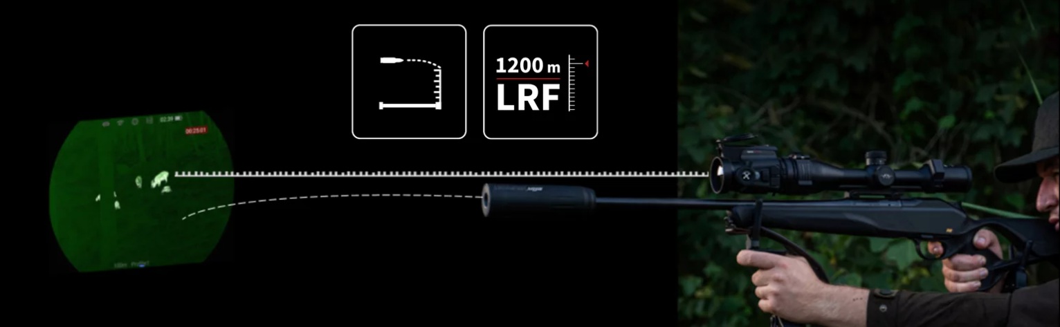 (LRF) s dosahem 1200 m s vestavěným balistickým výpočtem zajišťuje přesné měření
