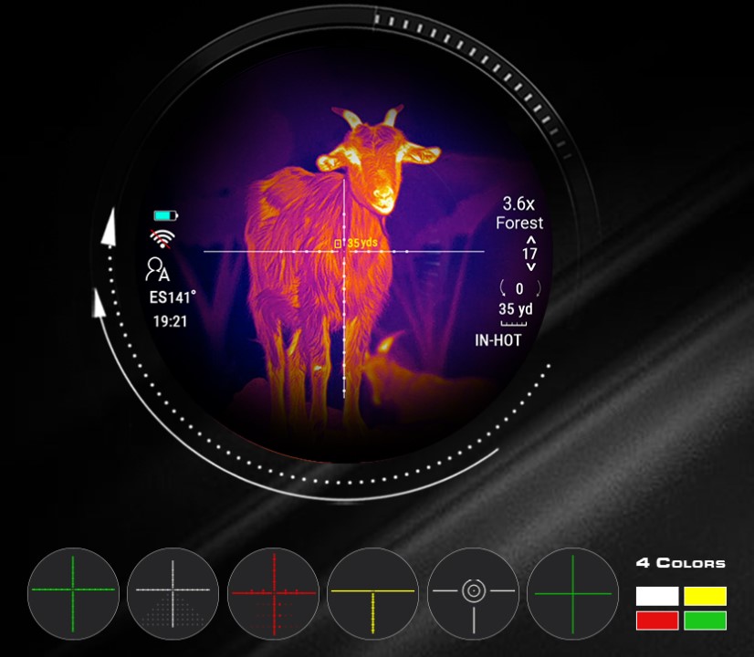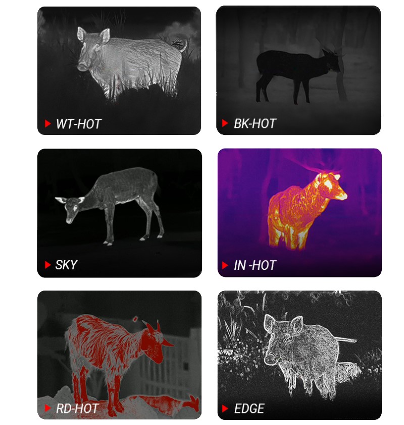 Pozorování Vám zpříjemní i 6 zobrazovacích módů (White Hot, Black Hot, Red Hot, EDGE, IN HOT, SKY) a máte také na výběr ze tří pozorovacích scén (City, Rain, Forest).